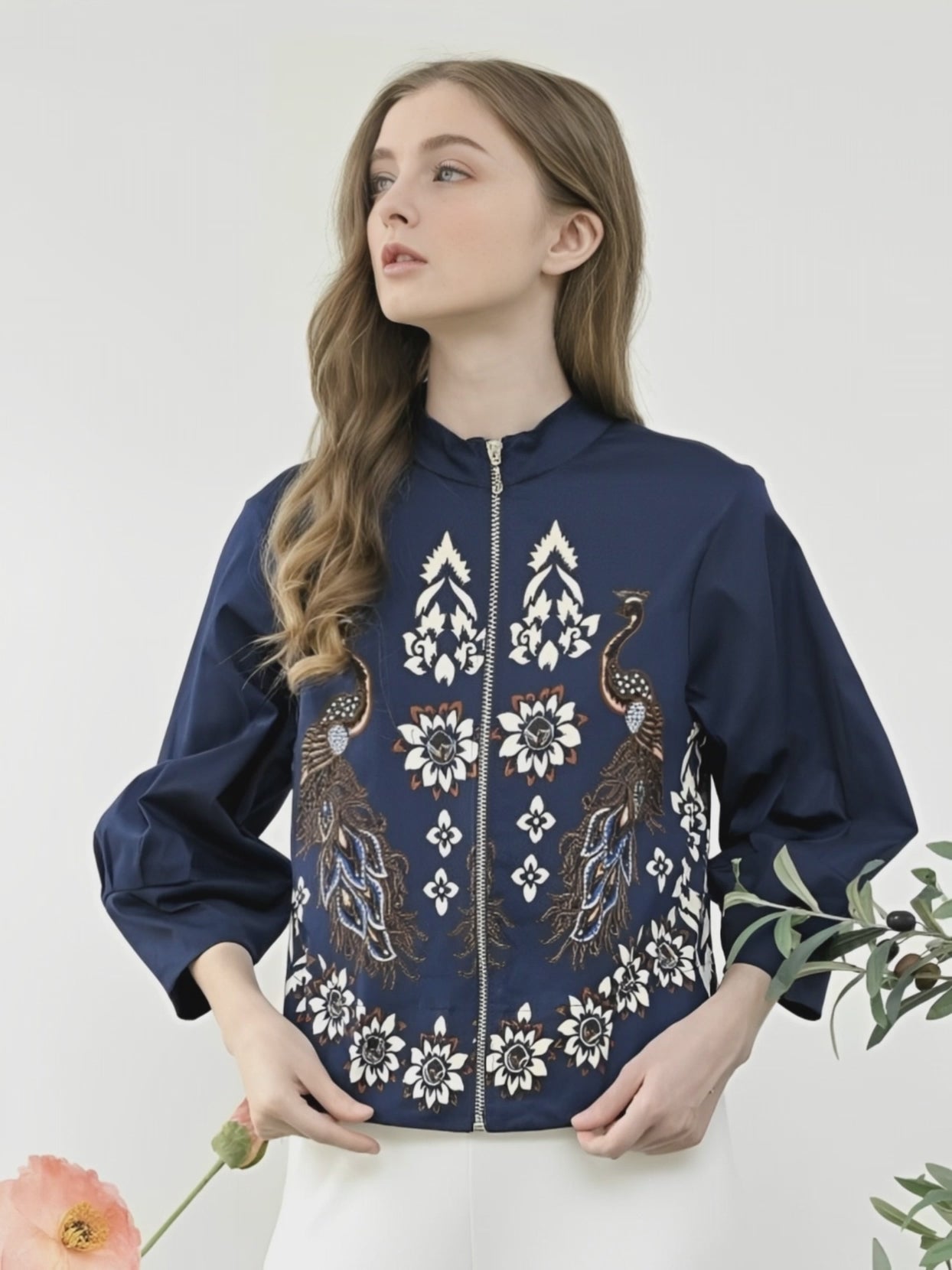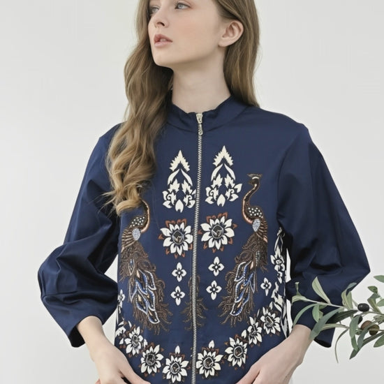 Batik Singapore presents the Midnight Peacock Batik Jacket, a stunning fusion of heritage and contemporary fashion. This exquisite piece features intricately embroidered peacocks surrounded by floral motifs on a luxurious navy blue fabric, symbolizing grace and elegance. The structured silhouette, complemented by a sleek zippered front and voluminous three-quarter sleeves, adds a modern edge to this timeless design.