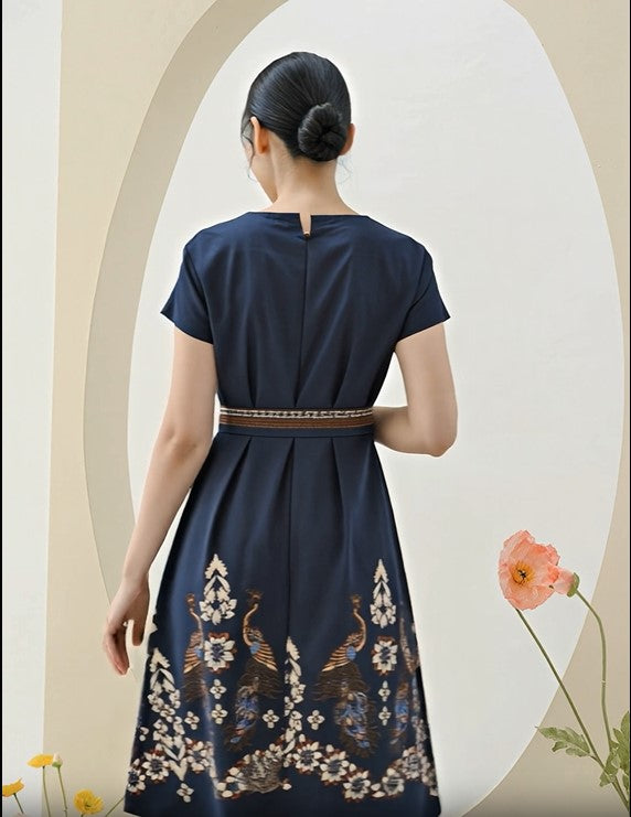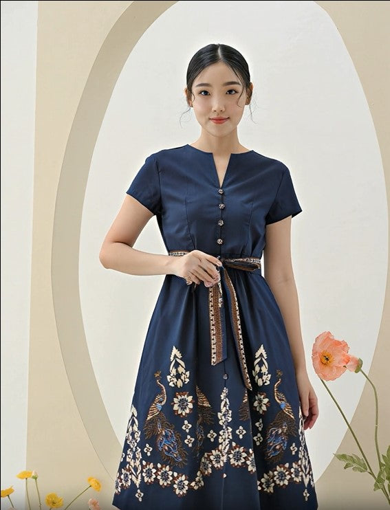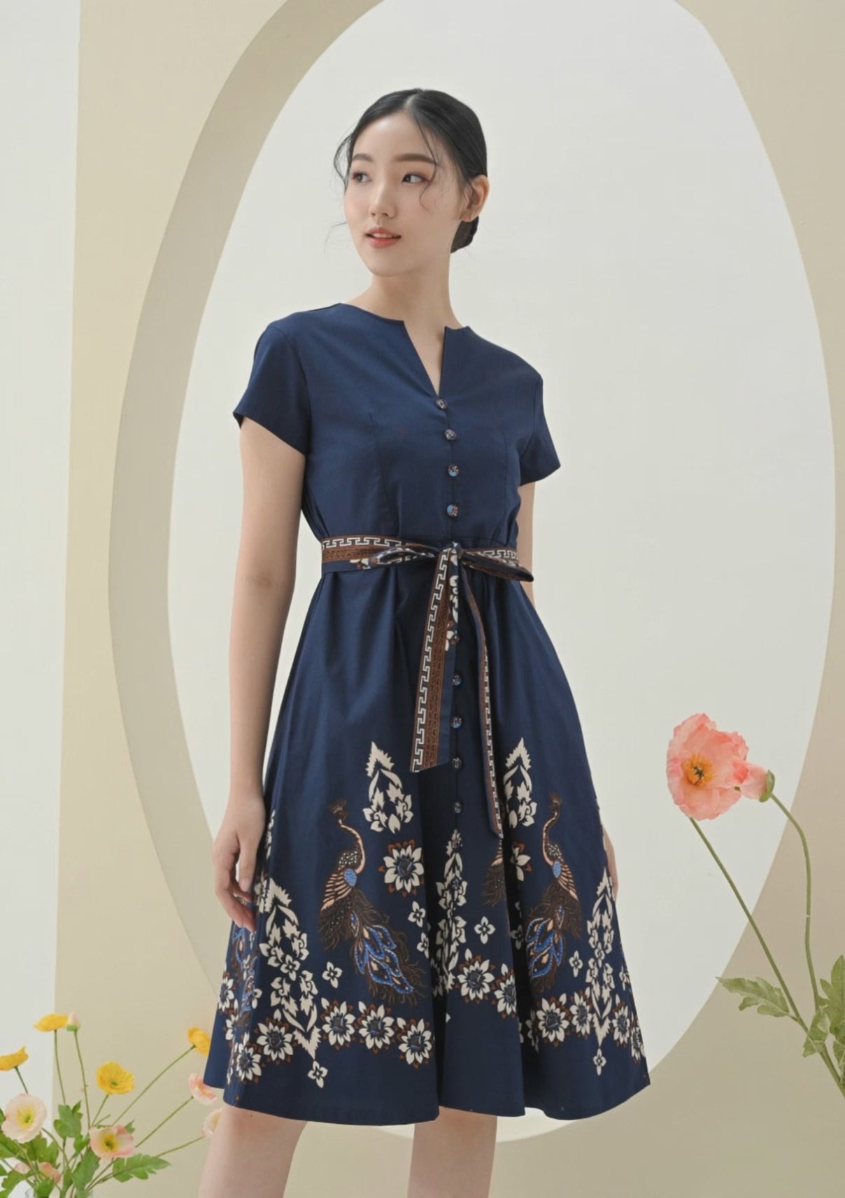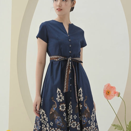 This eye-catching Batik midi dress boasts a bold, ornate floral and bird pattern in navy and beige tones. Made from a soft, breathable fabric, it has a structured silhouette and a tie waist for a flattering fit.